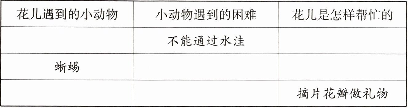 本题主要考查对故事内容的理解、概括能力以及想象力和语言表达能力。第一题需要从文中找到彩虹色的花表达心愿的语句进行作答;第二题需根据故事内容,梳理花儿遇到的小动物、小动物遇到的困难以及花儿是怎样帮忙的,将表格补充完整;第三题要求展开想象续写故事,需要结合前文彩虹色的花乐于助人的品质进行合理想象。
