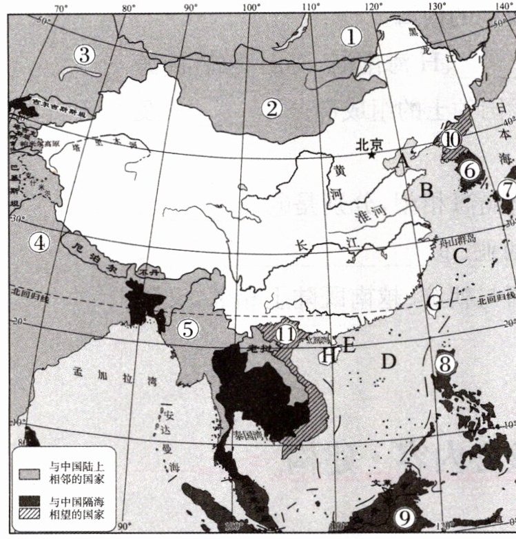 (5)隔海相望的国家:我国与8个国家隔海相望,分别是⑥