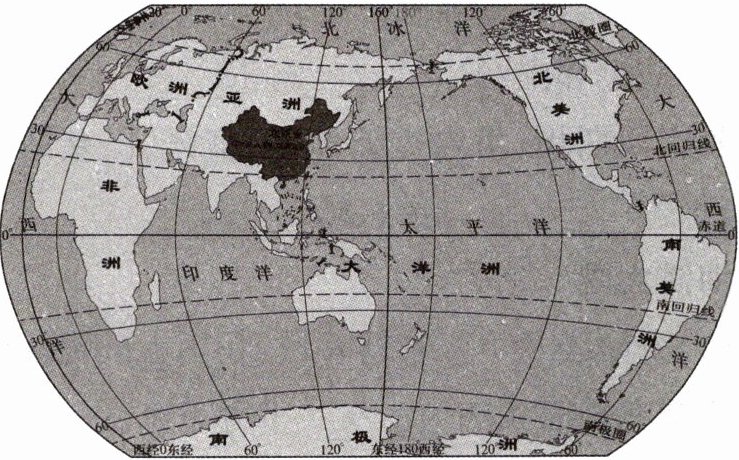 歌曲《我们伟大的祖国》这样描述我们伟大祖国的疆域辽阔:“当北国的钢花映红了飞雪,江南的田野正是春色妖娆。当东海的哨兵迎来了灿烂的朝霞,戈壁油田的灯光还在闪耀……”读中国在世界的位置图,回答1~2题。