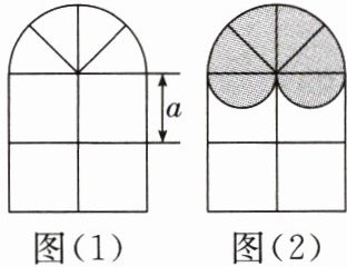 11. (20 分)(2025·芜湖)一扇窗户[如图(1)所示]的所有窗框(包含内部框架和外部框架)为铝合金材料,其下部是边长相同的四个小正方形,上部是半圆形,已知下部小正方形的边长是$a m$,窗户(包括上部和下部)全部安装透明玻璃,现在按照如图(2)所示的方式,在阴影部分的位置上全部安装窗帘,图(2)中窗帘下部分是两个直径为$a m$的半圆形,没有窗帘的部分阳光可以照射进来。(注:$\pi$取近似值 3)