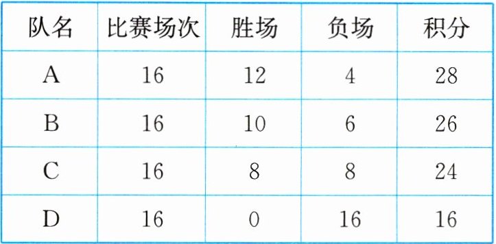 (2)不能.理由如下:设胜x场,则负(16-x)场.根据题意,得2x=16-x,解得x= $\frac{16}{3}$.因为场数必须是整数,所以x= $\frac{16}{3}$不符合题意.答:在这次比赛中,一个队的胜场总积分不能等于负场总积分.