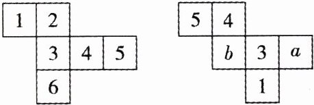 11. 一个正方体每个面的外部各写有一个数,如图所示的是它的两幅平面展开图,则a + b的值是______.