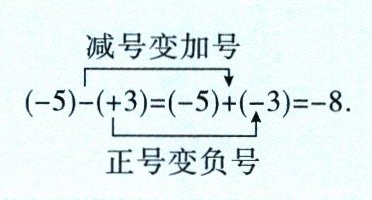 $(-5)-\underset{正号变负号}{\underbrace{-(+3)}}= (-5)+\underset{减号变加号}{\underbrace{(-3)}}= -8$.