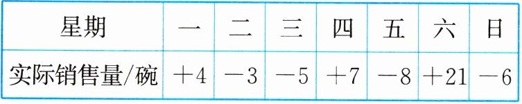 |实际销售量/碗|+4|-3|-5|+7|-8|+21|-6|