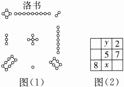 2. 把1~9这九个数填入3×3方格中,使其任意一行、任意一列及任意一条对角线上的数之和都相等,这样便构成了一个"九宫格".九宫格源于我国古代的"洛书"[图(1)],"洛书"是世界上最早的"幻方".图(2)是仅可以看到部分数值的"九宫格",则xʸ的值为______.