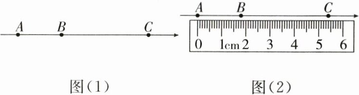 10. 如图(1)所示,点 $A$,$B$,$C$ 是数轴上从左到右排列的三个点,对应的数分别为 $-2$,$b$,$4$。某同学将刻度尺如图(2)所示放置,使刻度尺上的数字 $0$ 对齐数轴上的点 $A$,发现点 $B$ 对应刻度 $1.8cm$,点 $C$ 对应刻度 $5.4cm$,则数轴上点 $B$ 所对应的数 $b$ 为(