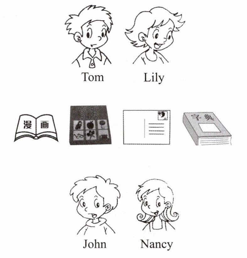 Tom: I'm going to buy a dictionary. Lily: I'm going to buy a postcard. John: I'm going to buy a comic book. Nancy: I'm going to buy a word book.