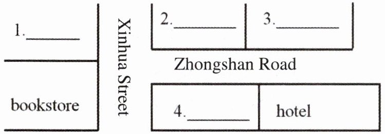 The school is next to the cinema and opposite (在……对面) the hotel. The hotel is next to the post office and opposite the school. The school and the cinema are in Zhongshan Road. The library is in Xinhua Street next to the bookstore and opposite the cinema.