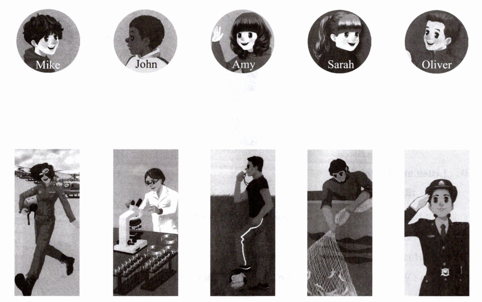 Mike wants to be a police officer. John wants to be a fisherman. Amy wants to be a scientist. Sarah wants to be a pilot. Oliver wants to be a coach.