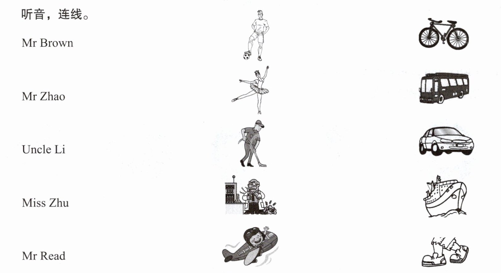 1. Mr Brown is a cleaner. He goes to work by bus. 2. Mr Zhao is a scientist. He goes to work by car. 3. Uncle Li is a football player. He goes to work by ship. 4. Miss Zhu is a dancer. She goes to work by bike. 5. Mr Read is a pilot. He goes to work on foot.