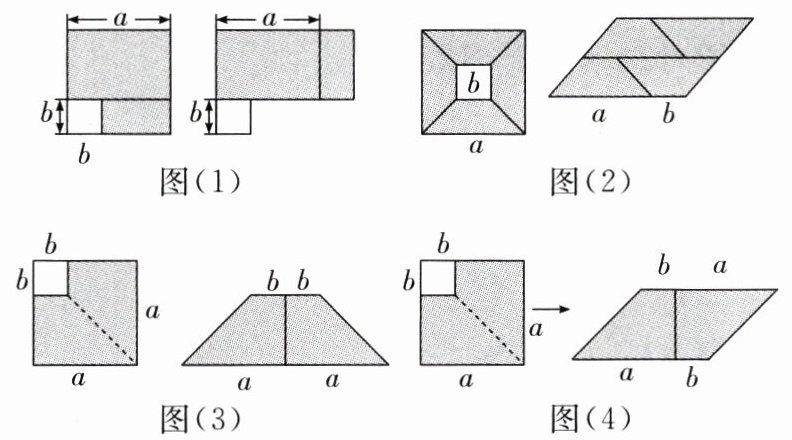7. 如图所示,阴影部分是边长为$a的大正方形剪去一个边长为b$的小正方形后所得到的图形,将阴影部分通过割、拼,形成新的图形,如图所示: