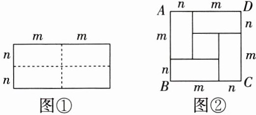(1)观察图②,试猜想式子 $ (m + n)^{2} $,$ (m - n)^{2} $,$ mn $ 之间的数量关系,并证明你的结论;
