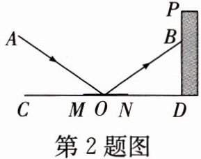 2. (跨学科—物理)如图所示,平面镜 $ MN $ 放置在水平地面 $ CD $ 上,墙面 $ PD \perp CD $ 于点 $ D $,一束光线 $ AO $ 照射到镜面 $ MN $ 上,反射光线为 $ OB $,$ \angle AOC = \angle BOD $. 点 $ B $ 在 $ PD $ 上,若 $ \angle AOC = 35^{\circ} $,则 $ \angle OBD $ 的度数为(