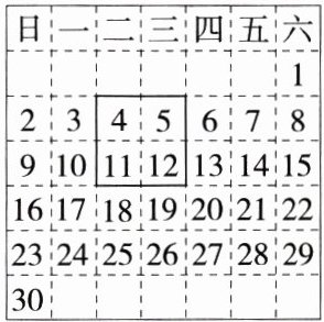 1. (1)如图所示是 2025 年 11 月的月历,一个方框圈出了四个数,我们作如下计算:$4×12= 48$,$5×11= 55$,$55 - 48 = 7$. 请你用一个方框另外圈出 4 个数,按相同方法计算,你有什么发现?