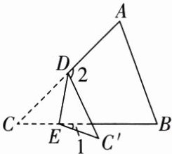 12. 如图所示,在三角形纸片 ABC 中,∠A = 65°,∠B = 70°,将∠C 沿 DE 折叠,使点 C 落在△ABC 外的点 C'处,若∠1 = 20°,则∠2 的度数为(
