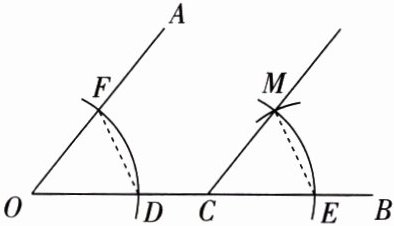 2. 如图所示,点$C在\angle AOB的边OB$上,利用尺规过点$C作OA的平行线CM$。由$OF= OD= CM= CE$,$DF= EM$,可得$\triangle ODF\cong\triangle CEM$,进而可以得到$\angle BCM= \angle AOB$,$CM// OA$,以上作图过程中的依据不包括 (