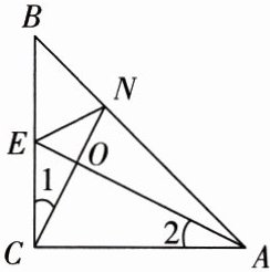5. 如图所示, 在 $ \triangle ABC $ 中, $ \angle CAB = \angle CBA = 45° $, $ CA = CB $, 点 $ E $ 为 $ BC $ 的中点, $ CN \perp AE $ 于点 $ O $, 交 $ AB $ 于点 $ N $.