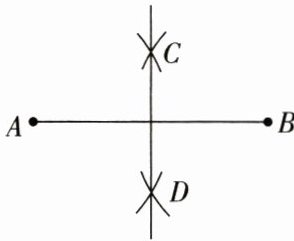 已知线段 $ AB $,求作线段 $ AB $ 的垂直平分线 $ CD $。