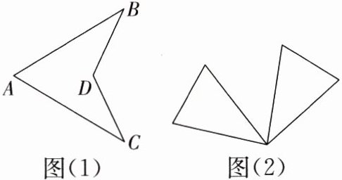 (2):是轴对称图形,对称轴为经过顶点(两图形的公共点)且垂直平分两图形相邻边夹角的平分线所在直线(或描述为使图形两部分沿此线对折后完全重合的直线,具体作图为连接两图形特殊点所成线段的中垂线),(实际作答时用直尺和圆规作出对称轴,这里文字表述为)作出其对称轴(一条直线,使图形沿此直线对折后两侧完全重合)。