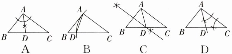 2. (2024·昆明)在 $ \triangle ABC $ 中,$ \angle BAC = 90^{\circ} $,$ AB \lt AC $。用尺规在 $ BC $ 边上找一点 $ D $,使 $ AD + DC = BC $,下列作法正确的是(