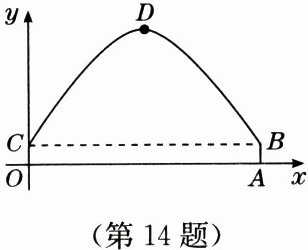14. 如图,隧道的横截面由抛物线和矩形 $ OABC $ 构成. 矩形一边 $ OA $ 的长是 $ 12 $ m,另一边 $ OC $ 的长是 $ 1 $ m. 抛物线上的最高点 $ D $ 到地面 $ OA $ 的距离为 $ 7 $ m. 以 $ OA $ 所在直线为 $ x $ 轴,$ OC $ 所在直线为 $ y $ 轴,建立平面直角坐标系.
