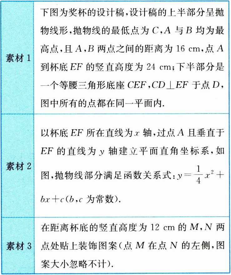 | 素材 1 | 下图为奖杯的设计稿,设计稿的上半部分呈抛物线形,抛物线的最低点为 $ C $,$ A $ 与 $ B $ 均为最高点,且 $ A $,$ B $ 两点之间的距离为 $ 16 $ cm,点 $ A $ 到杯底 $ EF $ 的竖直高度为 $ 24 $ cm;下半部分是一个等腰三角形底座 $ CEF $,$ CD \perp EF $ 于点 $ D $,图中所有的点都在同一平面内. |