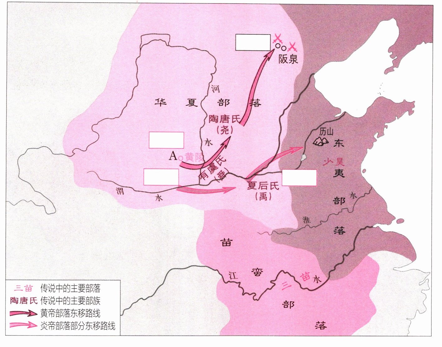 (1)自上而下、自左而右依次为:黄帝 炎帝 蚩尤 (2)涿鹿 (3)华夏部落(由黄帝部落、炎帝部落联合而成)主要活动于黄河流域的陕西、山西、河南等地;东夷部落主要活动于东部的山东、江苏、安徽等地;苗蛮部落主要活动于南方的湖北、江西、湖南等地。(4)B