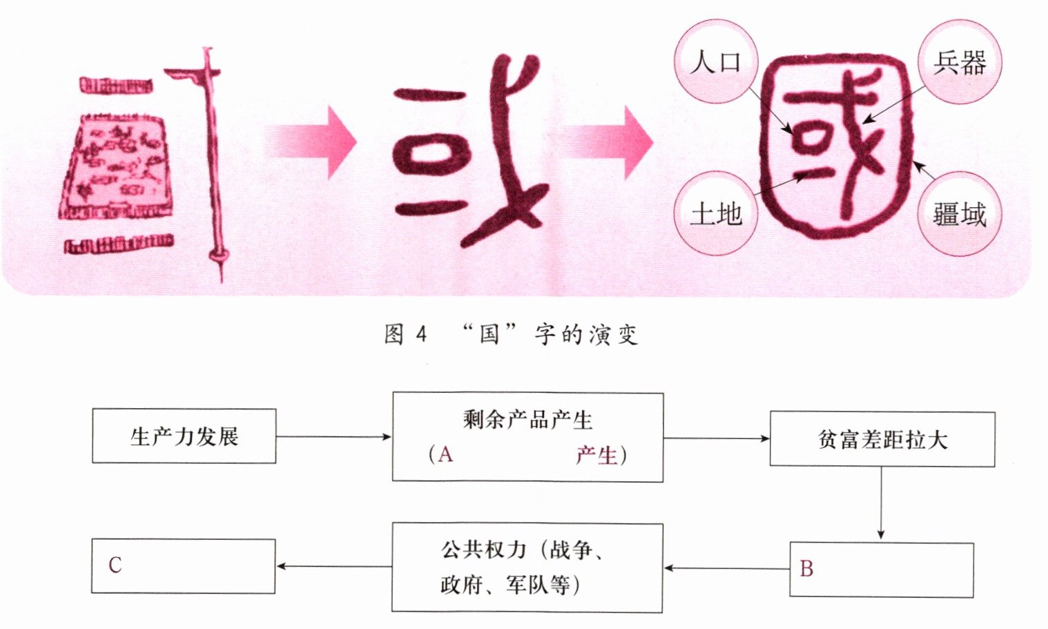 同学们,你们知道国家的“国”字是怎么演变来的吗?如图 4 所示,就是士兵拿着武器“戈”,守卫着“疆域”里的“人口”和“土地”。大约在 5000 年前,随着生产力的发展,人类进入文明社会。私有制、阶级和国家的产生是人类进入文明社会的重要标志。请正确填写 A、B、C 三处,将图表补充完整。