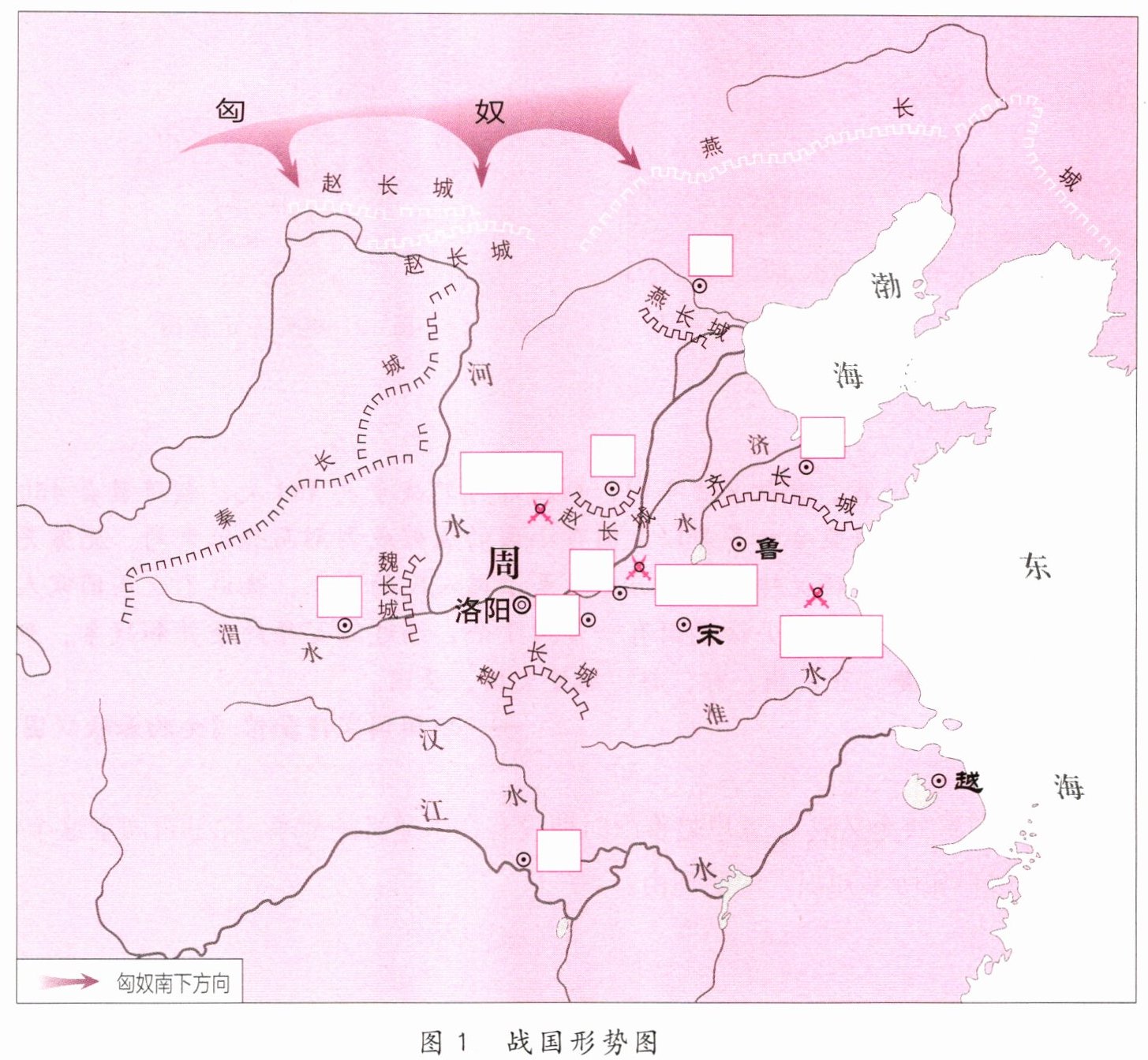 (1) 在图1相应的红框内填出战国七雄诸侯国的国名。
