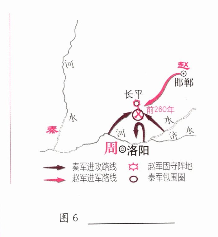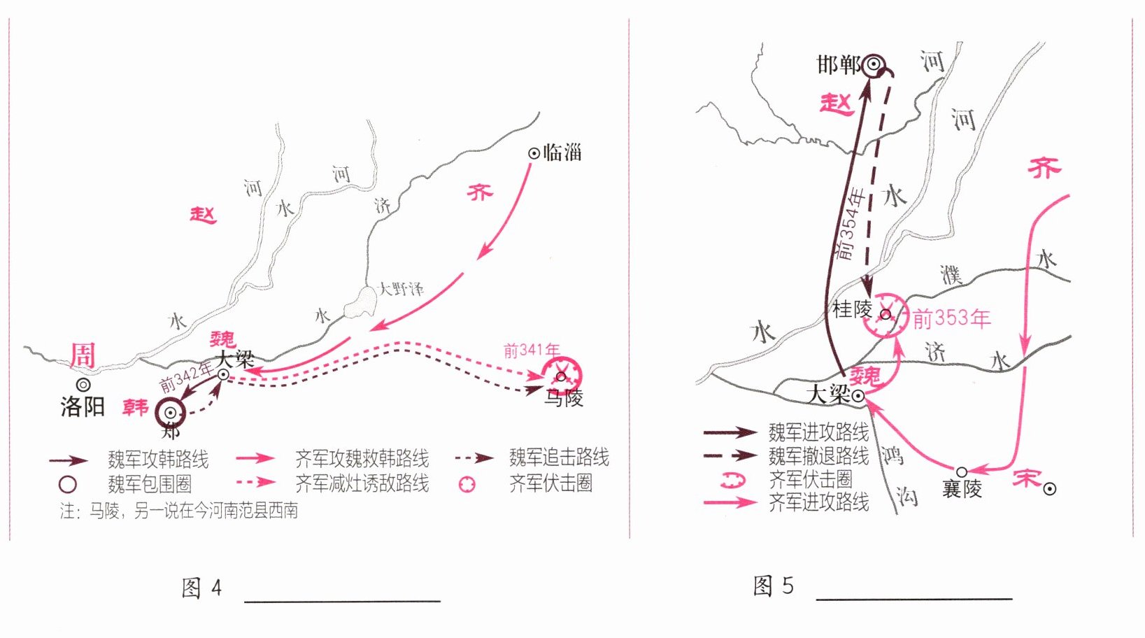 3.(1)图4:马陵之战 图5:桂陵之战 图6:长平之战 (2)马陵之战:齐国、魏国和韩国;桂陵之战:齐国、赵国和魏国;长平之战:秦国、赵国。(3)成语:增兵减灶、围魏救赵、纸上谈兵。