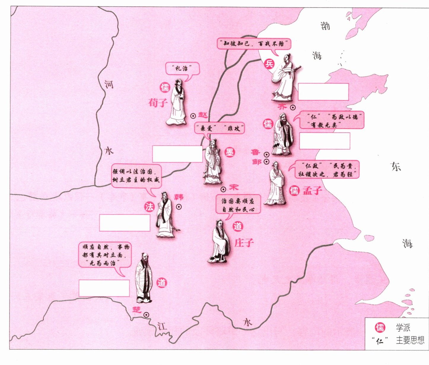 (1)图名:诸子百家。(2)自上而下分别为:孙武 孔子 墨子 韩非 老子 (3)主要分布在黄河中下游地区。