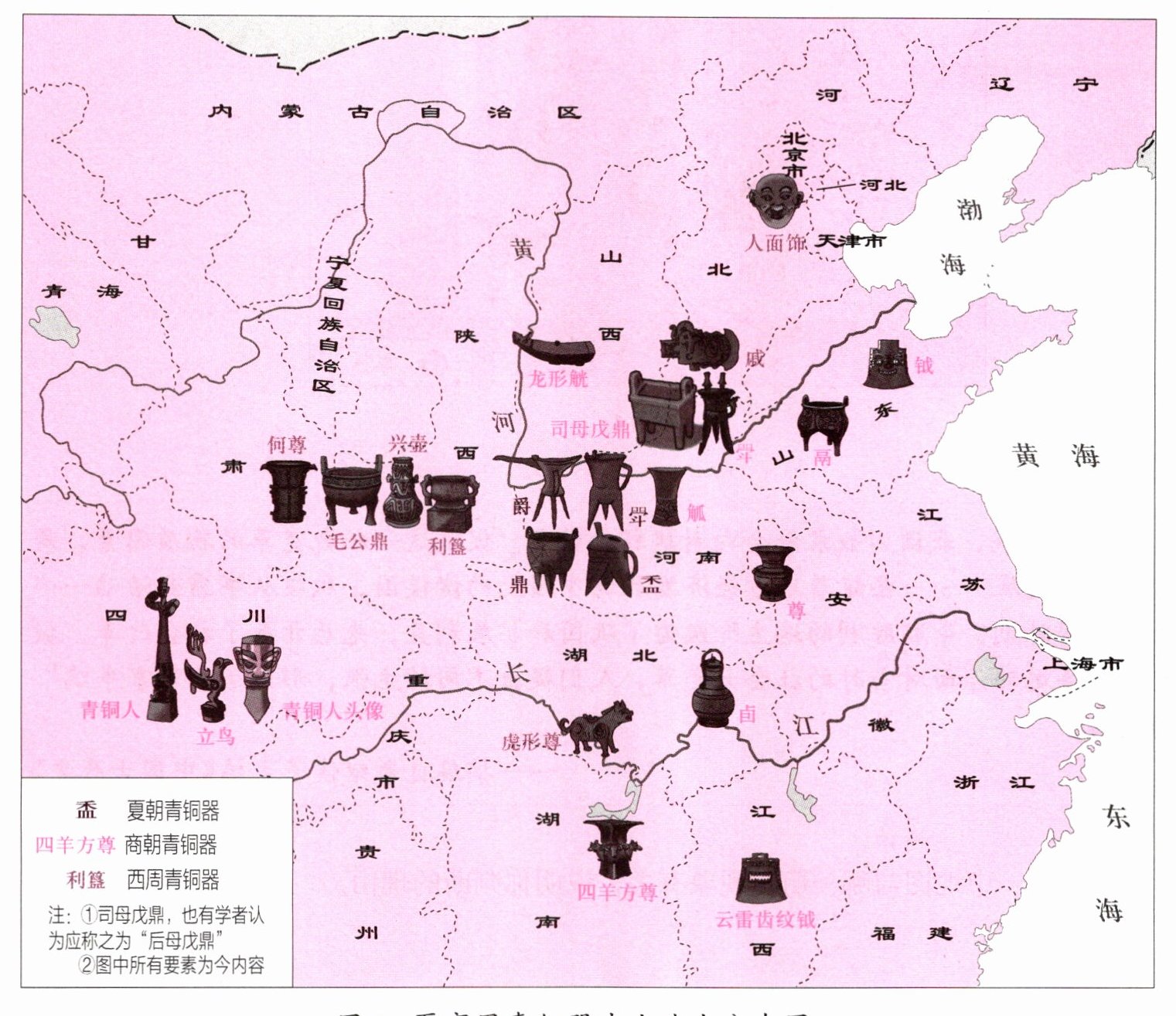 (2)“盉(夏朝青铜器)、四羊方尊(商朝青铜器)、利簋(西周青铜器)”,结合图1进行圈画 。河南