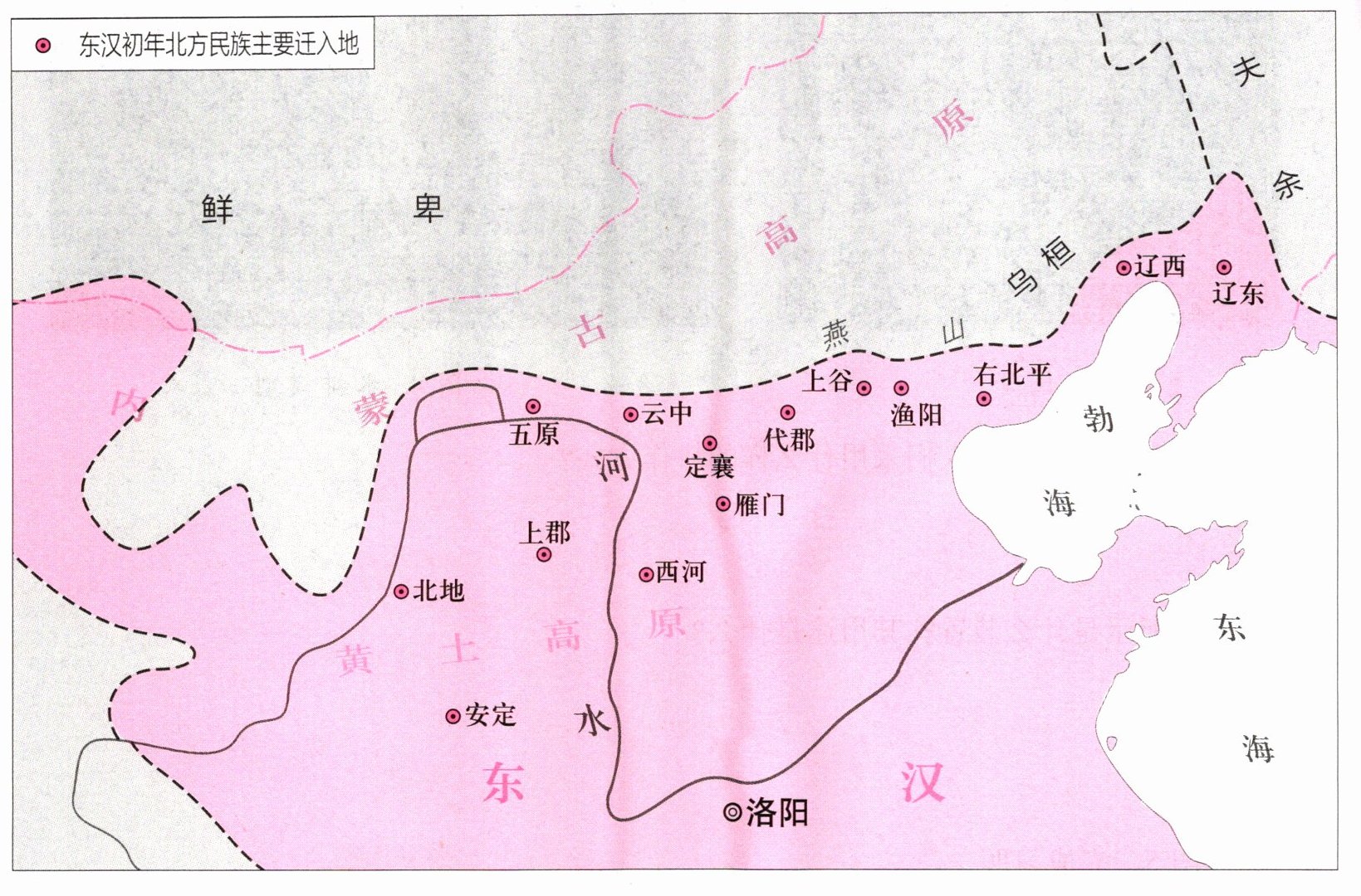 。(2) 东汉初年,光武帝允许一些北方民族迁入边疆地带与汉人杂居。从地图可以看出,北方民族迁入地主要分布在