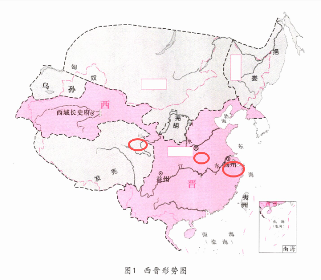 (1) 在图1红框内填出西晋的都城以及部分北方民族的名称。
