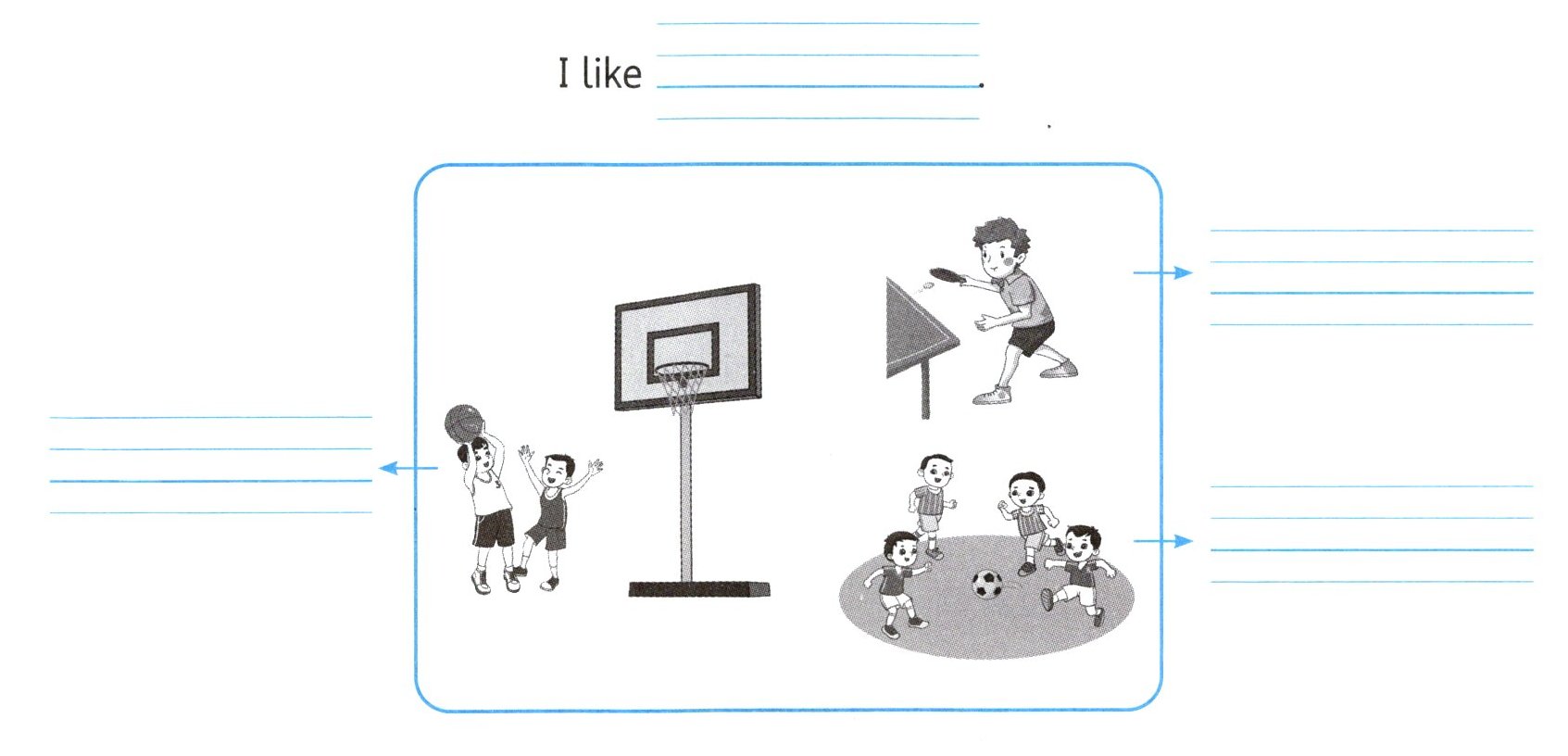 Ⅲ. Look and write. 看一看,完成句子,并写出相应的运动。
