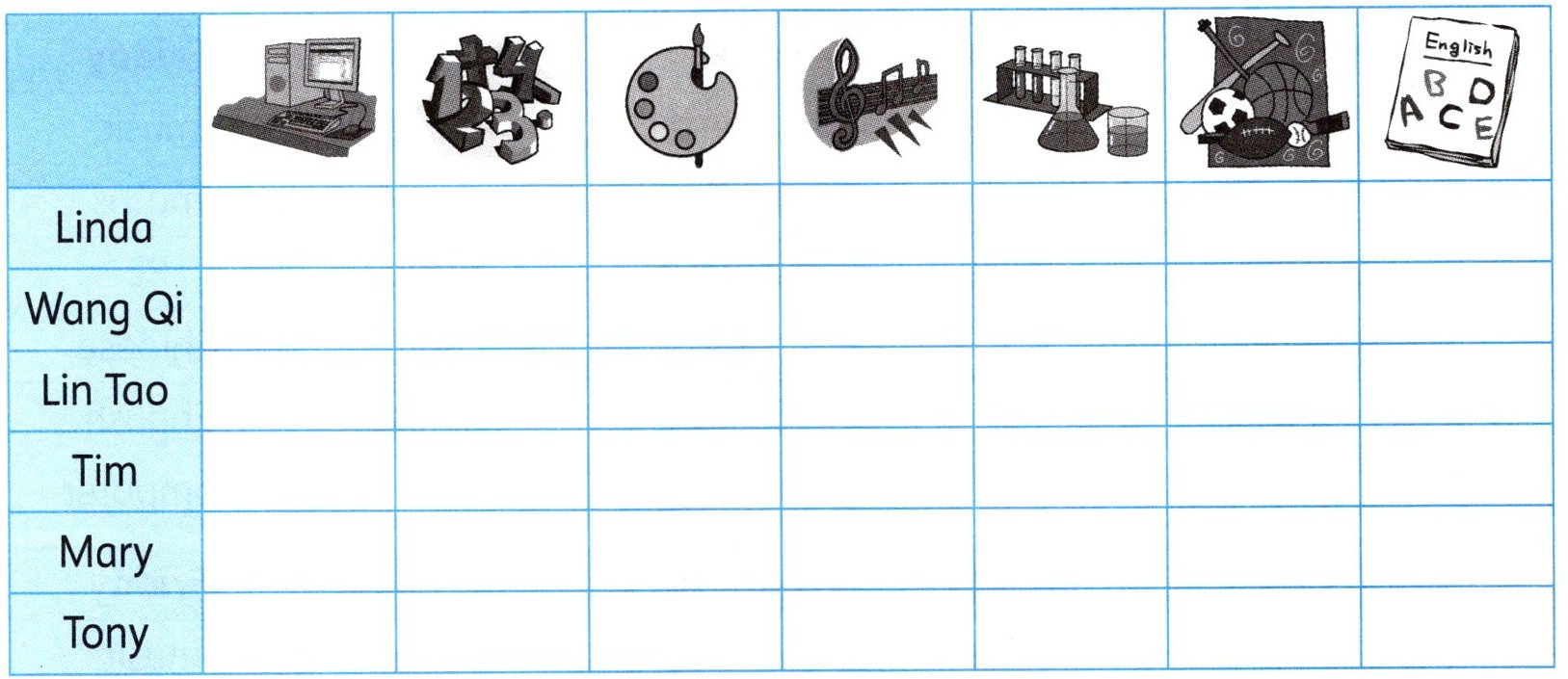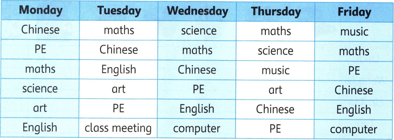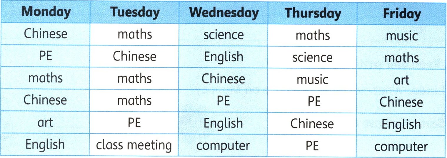 Tom: Look at the timetable. We have science, maths, Chinese and PE in the morning. We have English and computer class in the afternoon.