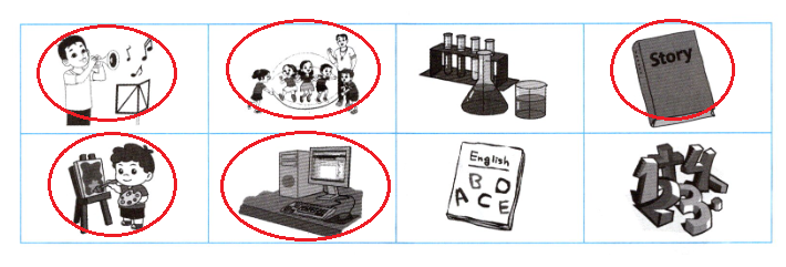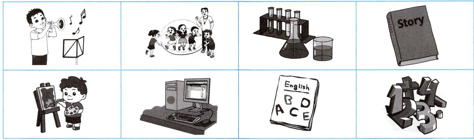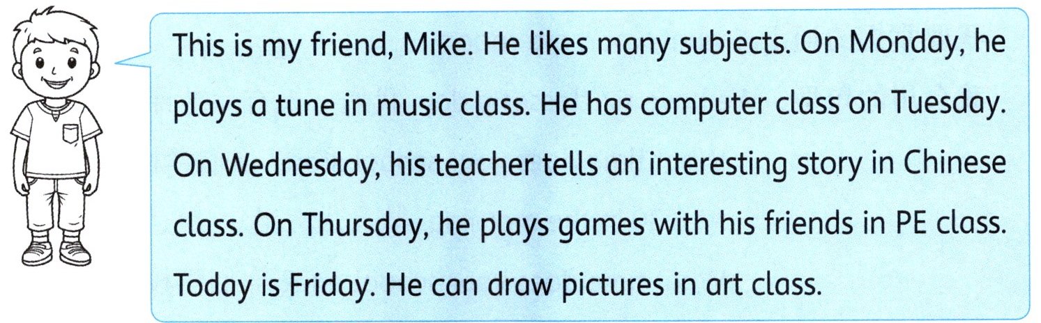 This is my friend, Mike. He likes many subjects. On Monday, he plays a tune in music class. He has computer class on Tuesday. On Wednesday, his teacher tells an interesting story in Chinese class. On Thursday, he plays games with his friends in PE class. Today is Friday. He can draw pictures in art class.