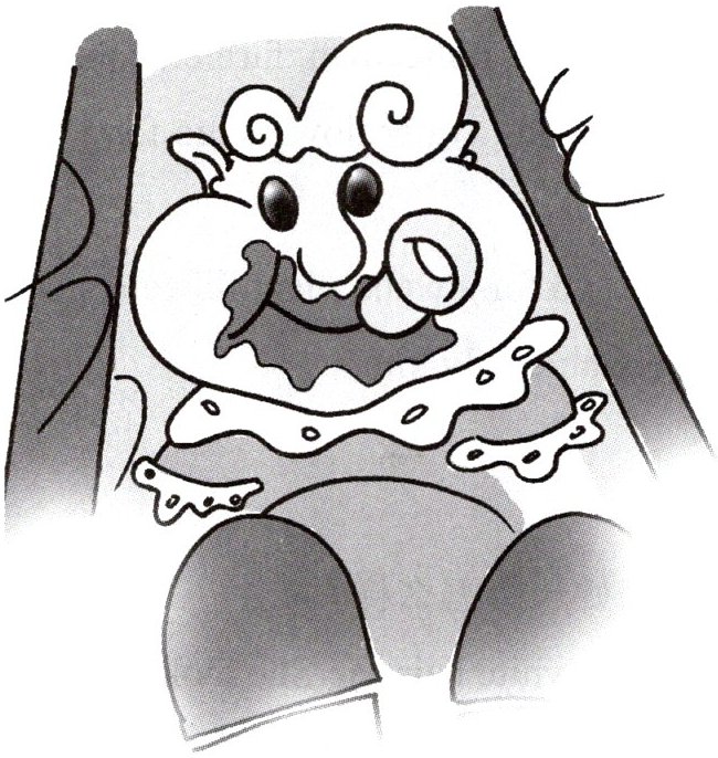 I see a baby. The baby has ice cream on his face. I point. "Look!" I say. "Ice cream!"