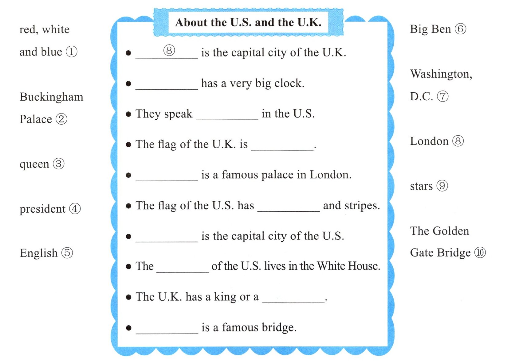 Do you know the capital (county/city) of the U.K.? It's London. What do they (tell/speak) in the U.K.? Guess! They speak (English/French). There are many famous places in the U.K. Do you know about Big Ben? It's in London. It has a very big (clock/flag). The U.K. (has/is) a king or a queen. Kings and queens (live/lives) in palaces. There is a famous palace in London — Buckingham Palace.
