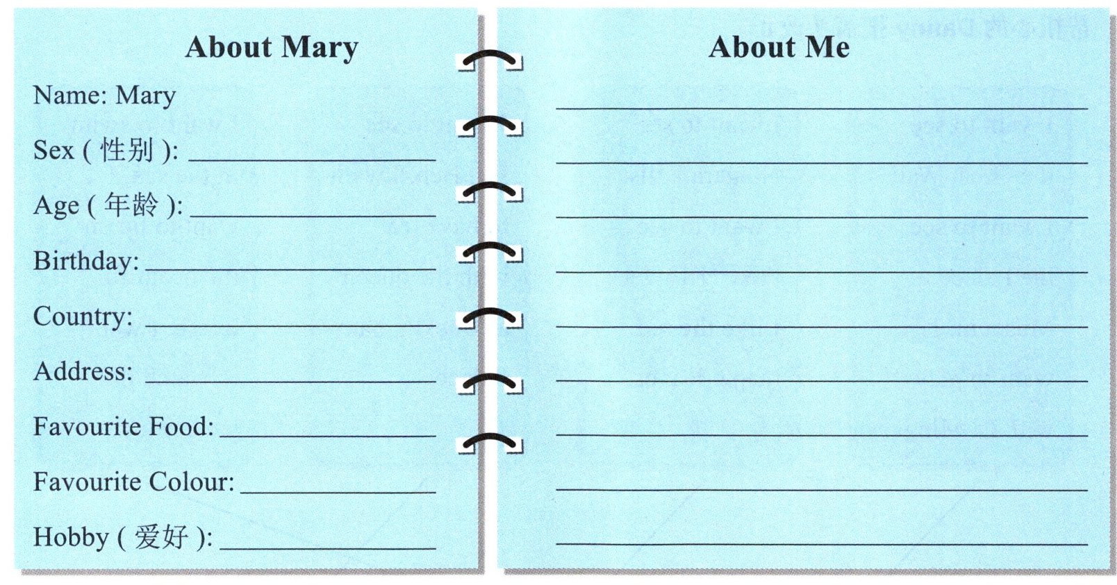 Hi! My name is Mary. I’m a girl. I’m from Australia. I’m twelve years old. When is my birthday? Oh, my birthday is October 8. My favourite colour is white. My favourite food is rice and fish. I like to sing songs. My address is 100 Wangfujing Street. My father and mother are teachers. They work at the same school in Beijing.