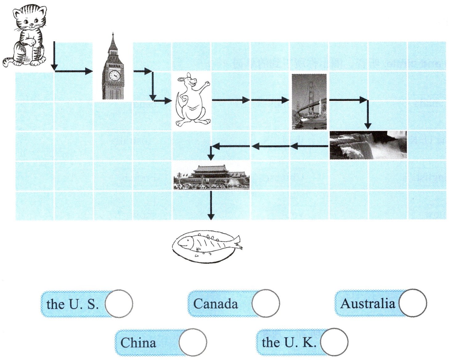Ⅳ. The cat is looking for a fish. Look at the picture and order the countries. 小猫正在找鱼,根据路线及图片,给相应的国家标序号。