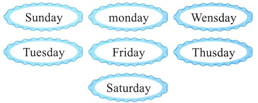 Ⅲ. Circle and correct. 火眼金睛,找出拼写错误的星期单词,然后改正。