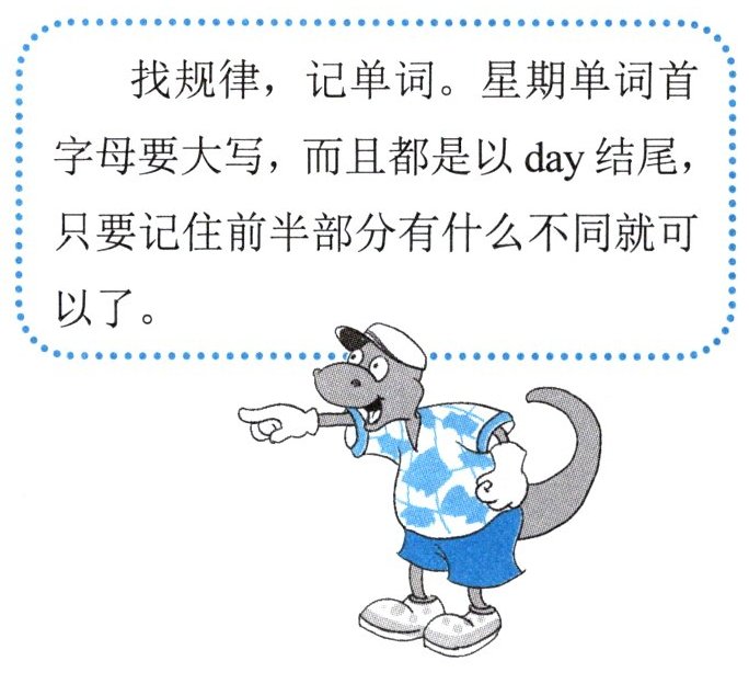 找规律,记单词。星期单词首字母要大写,而且都是以 day 结尾,只要记住前半部分有什么不同就可以了。