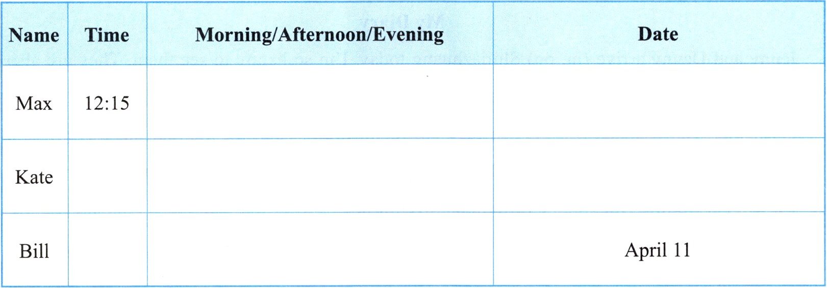 | Name | Time | Morning/Afternoon/Evening | Date |