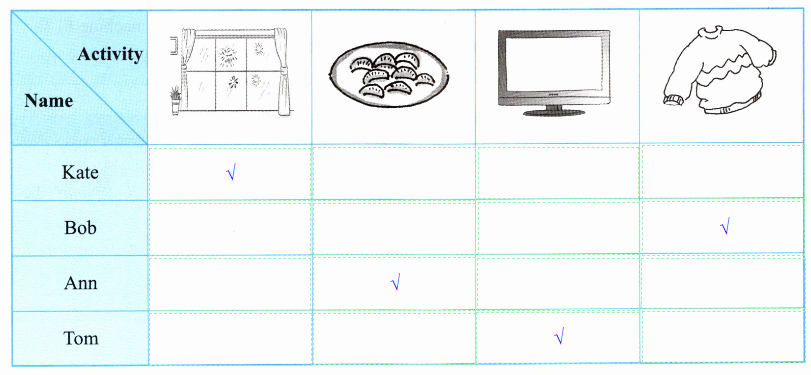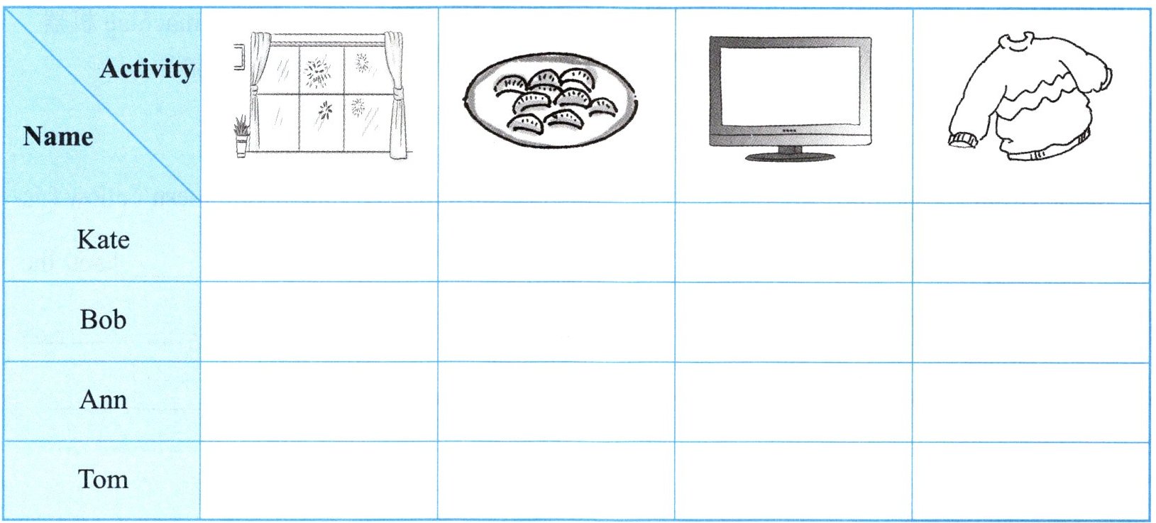 Ⅰ. Listen, tick and complete the sentences. 听对话,请用“√”选出几位同学春节喜欢做的事情,并完成句子。
