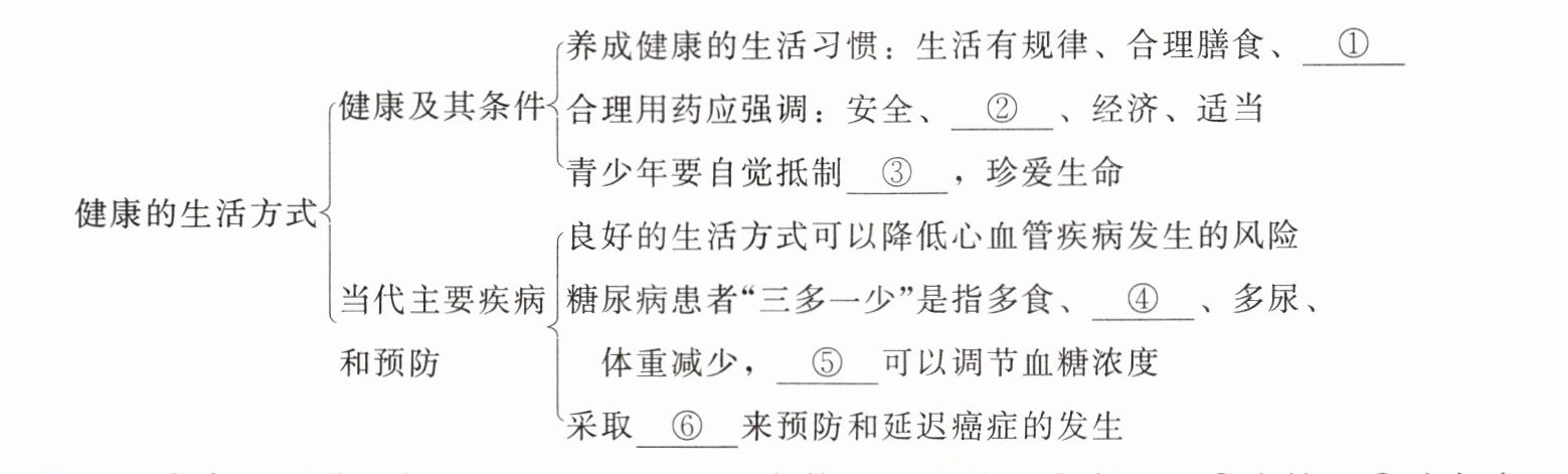 提示:①合理用药及拒绝吸烟、酗酒、吸毒等 ②有效 ③毒品 ④多饮 ⑤胰岛素 ⑥健康的生活方式