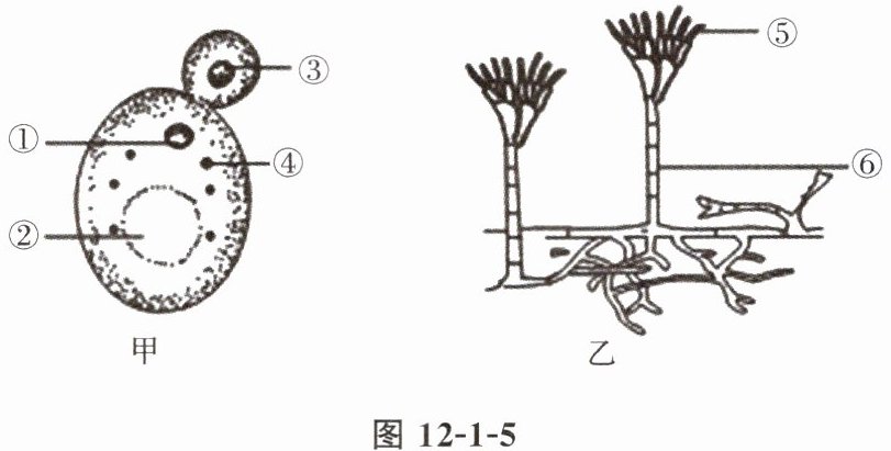 6. 图 12-1-5 是某学生做“观察酵母菌和霉菌”实验时绘制的显微镜下观察到的酵母菌(甲)和青霉菌(乙)形态结构简图,请你根据所做过的实验和观察到的实验现象,回答下列问题。