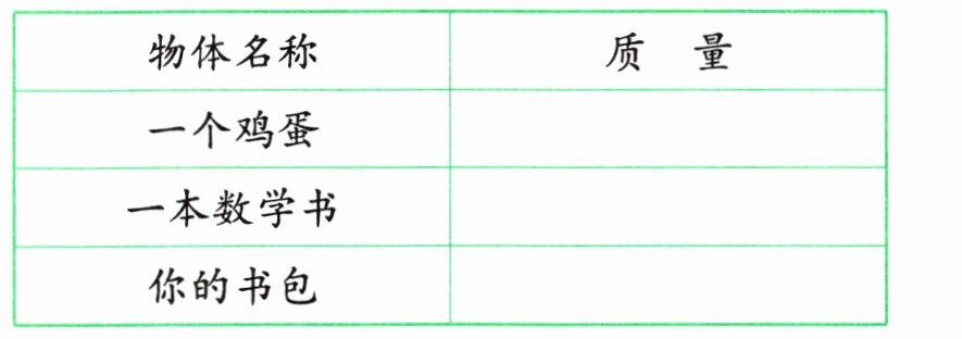 2. 找到下面的物体,选择合适的秤称一称,并记录它们的质量。