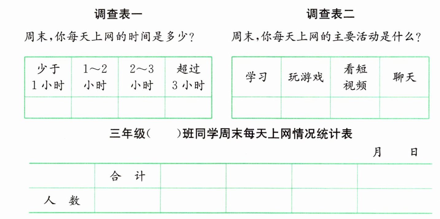 1. 从下面的调查表中选择一种,了解周末全班同学每天上网的情况,并根据收集的数据完成统计表。