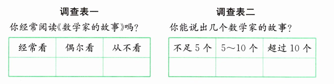 二;能更具体地了解同学们对《数学家的故事》的阅读掌握情况,通过说出故事的数量能直观反映阅读效果,而调查表一的“经常看”“偶尔看”比较模糊,不能准确体现阅读的实际情况。